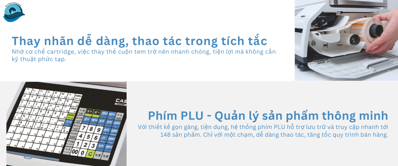 - Kho mẫu tem phong phú: Cung cấp sẵn hơn 45 mẫu thiết kế chuẩn và 20 mẫu tùy chỉnh thông qua phần mềm CL-Works, giúp thiết kế tem, cập nhật dữ liệu PLU, quản lý sản phẩm và xuất báo cáo chỉ bằng vài thao tác.