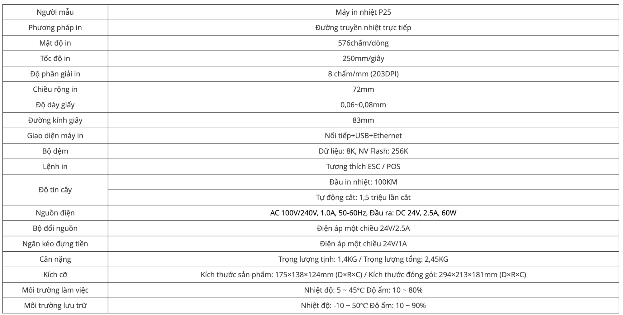 Thông số Kỹ thuật Máy in hoá đơn Elanda P25