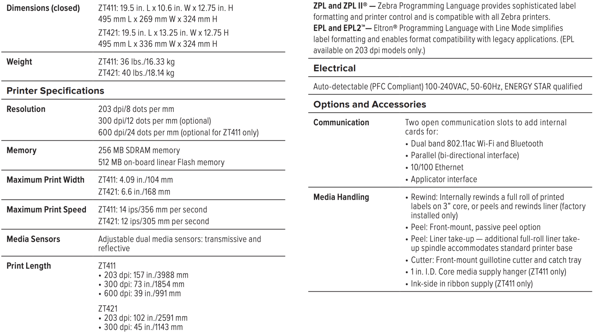 Thông số Kỹ thuật của Máy in mã vạch công nghiệp Zebra ZT411