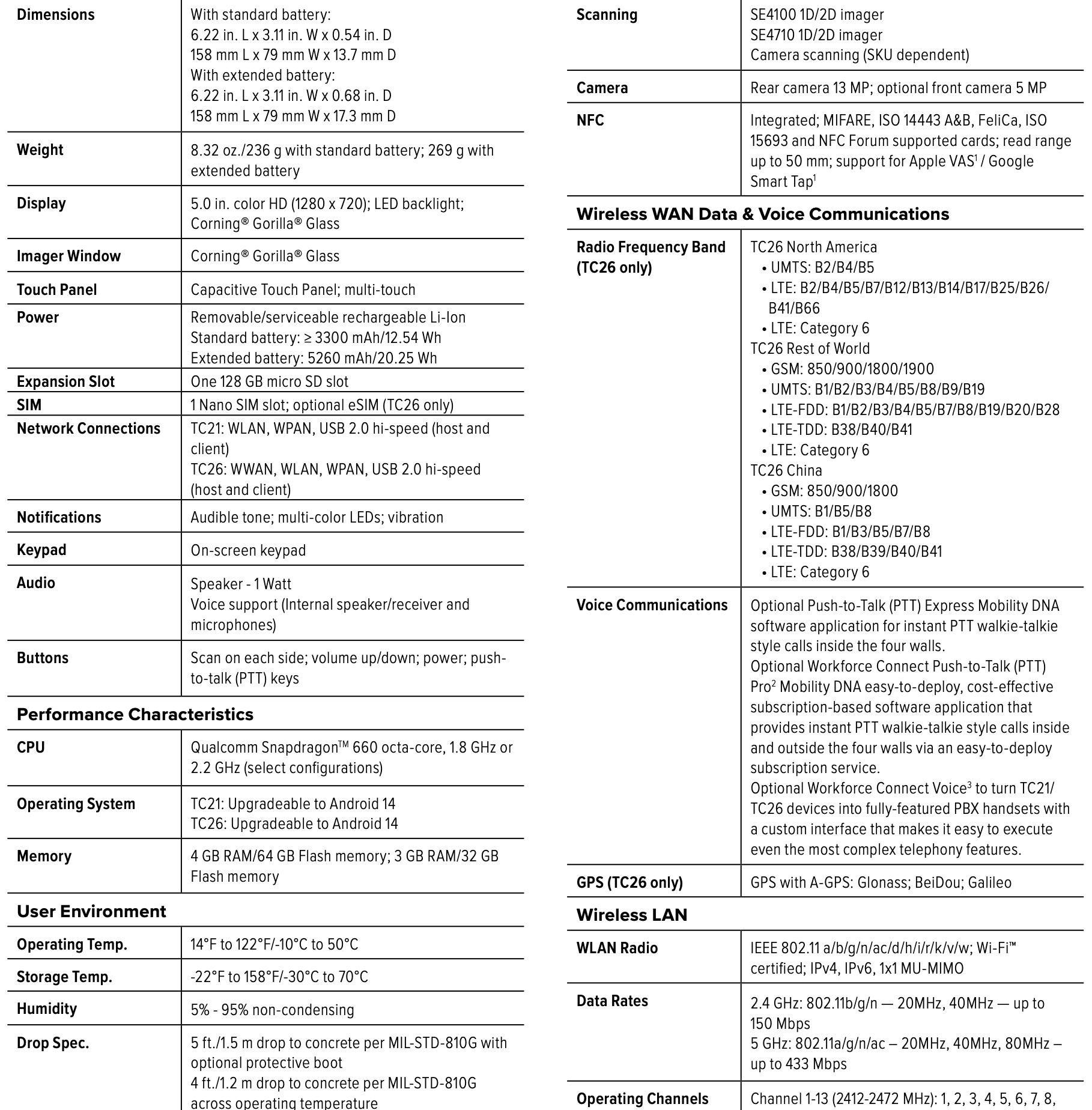Thông số kỹ thuật của Máy kiểm kho Zebra TC21