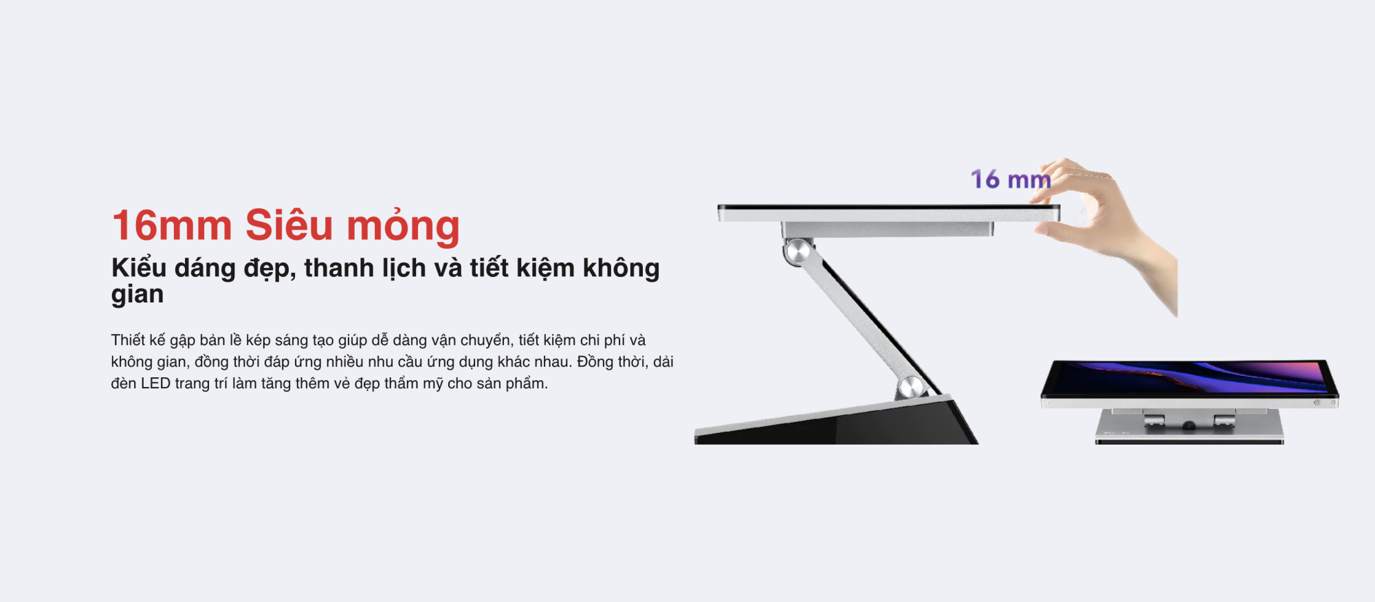 - Cơ chế gập hai bản lề (Dual-Hinge) cho phép xoay, gập linh hoạt để nhân viên dễ thao tác và khách hàng dễ quan sát hóa đơn.