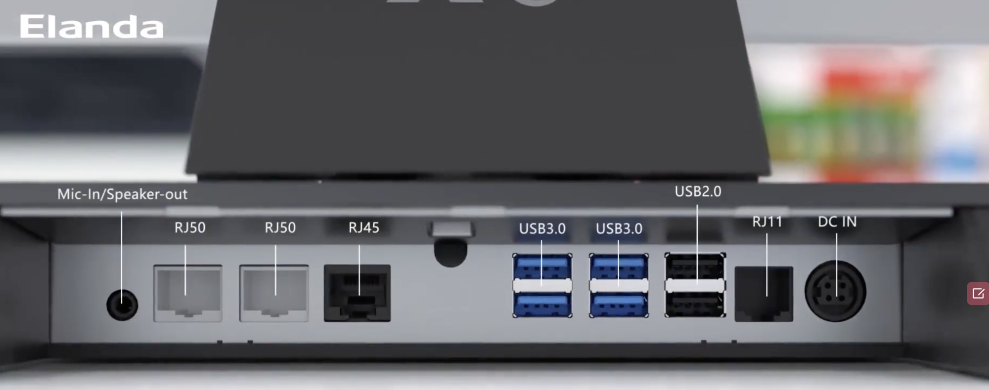 - Serial (RS232): 2×RJ50, hỗ trợ máy in hóa đơn, cân điện tử, máy quét mã vạch.