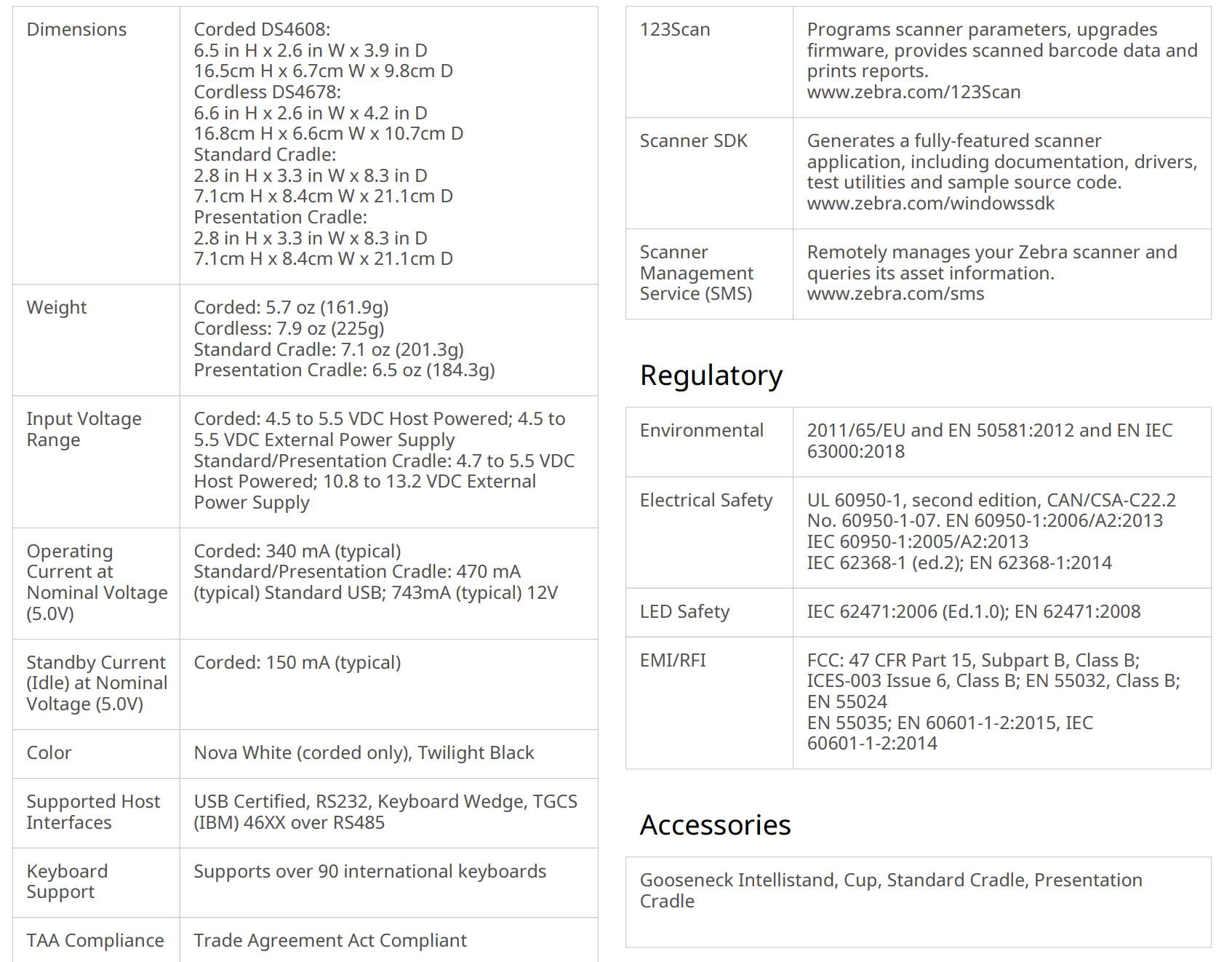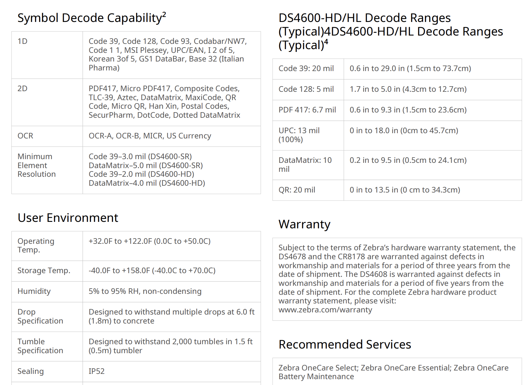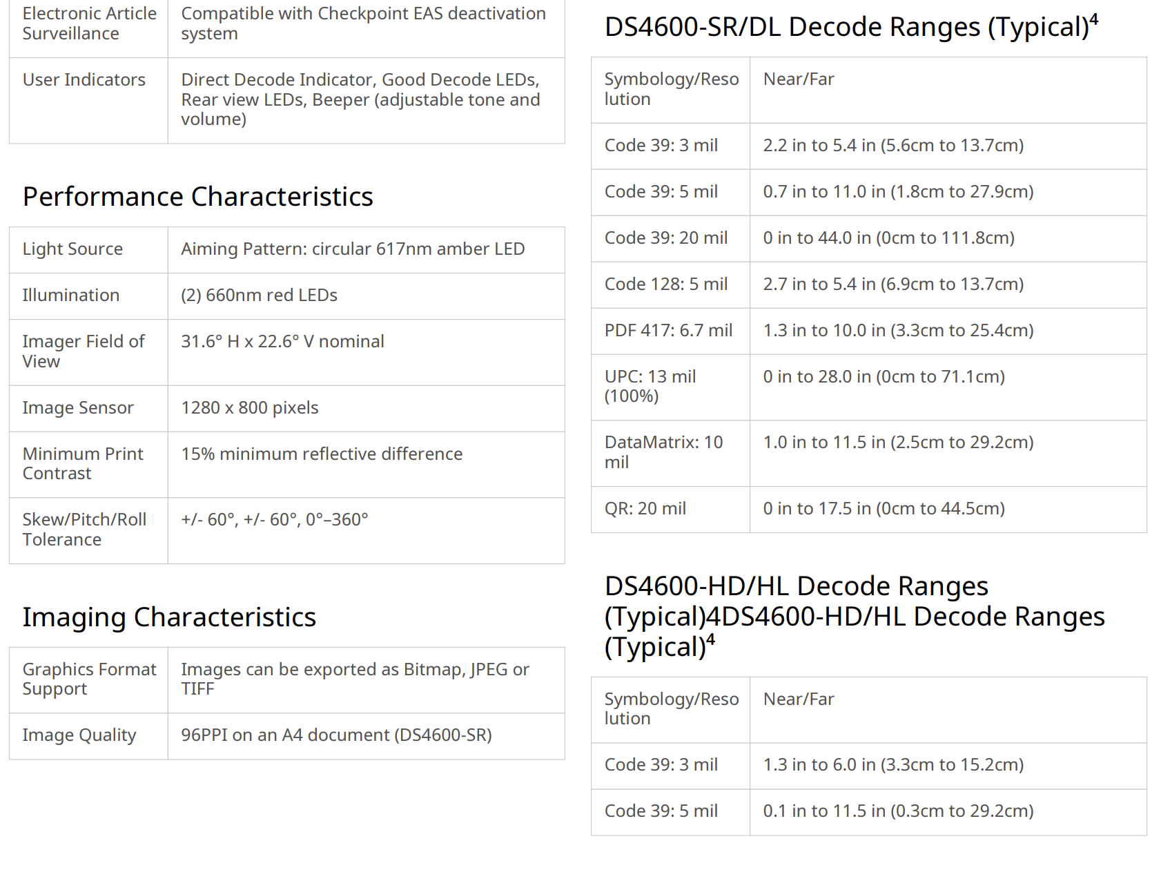Thông số kỹ thuật của máy quét Qrcode Zebra DS4608
